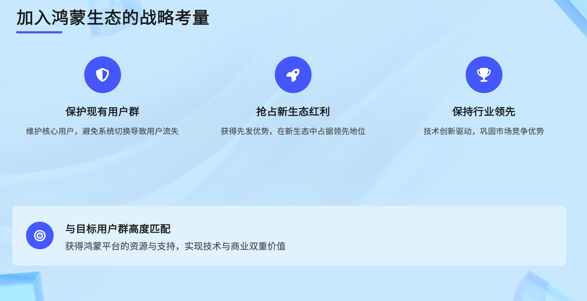 鸿蒙生态正处于爆发前夜,应用数量相对有限,对于早期进入者而言,正处于低竞争、高曝光、高价值的黄金阶段。接入鸿蒙不仅能响应支持国产生态的趋势,还能以较低成本获得高权重的系统能力入口,抢占新生态红利。同时,提前布局新技术生态,能让团队提前熟悉新开发框架,产品提前规划新交互能力,为后续能力扩展奠定基础,从而在未来保持市场主动权。