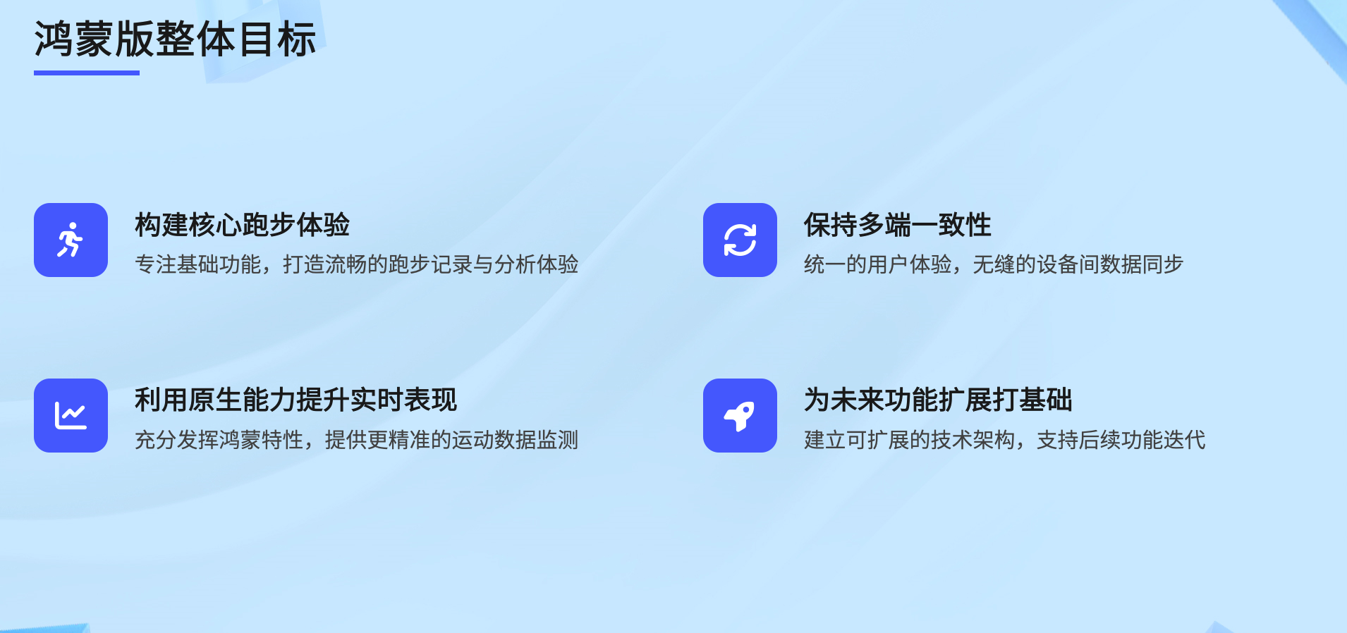 悦跑圈鸿蒙版的落地遵循明确的目标与分步推进策略,在研发过程中重点挖掘鸿蒙特性,实现了基础功能稳定与特色体验创新的双重目标。
