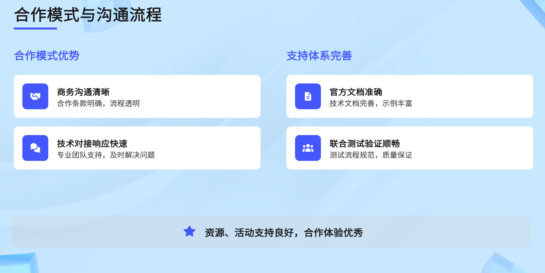 与鸿蒙生态的合作过程中,商务沟通清晰、合作条款明确、流程透明;技术对接响应快速,专业团队及时解决问题;联合测试验证顺畅,测试流程规范保障质量;官方还提供鸿蒙生态学堂等资源与活动支持,为项目推进提供了有力保障。