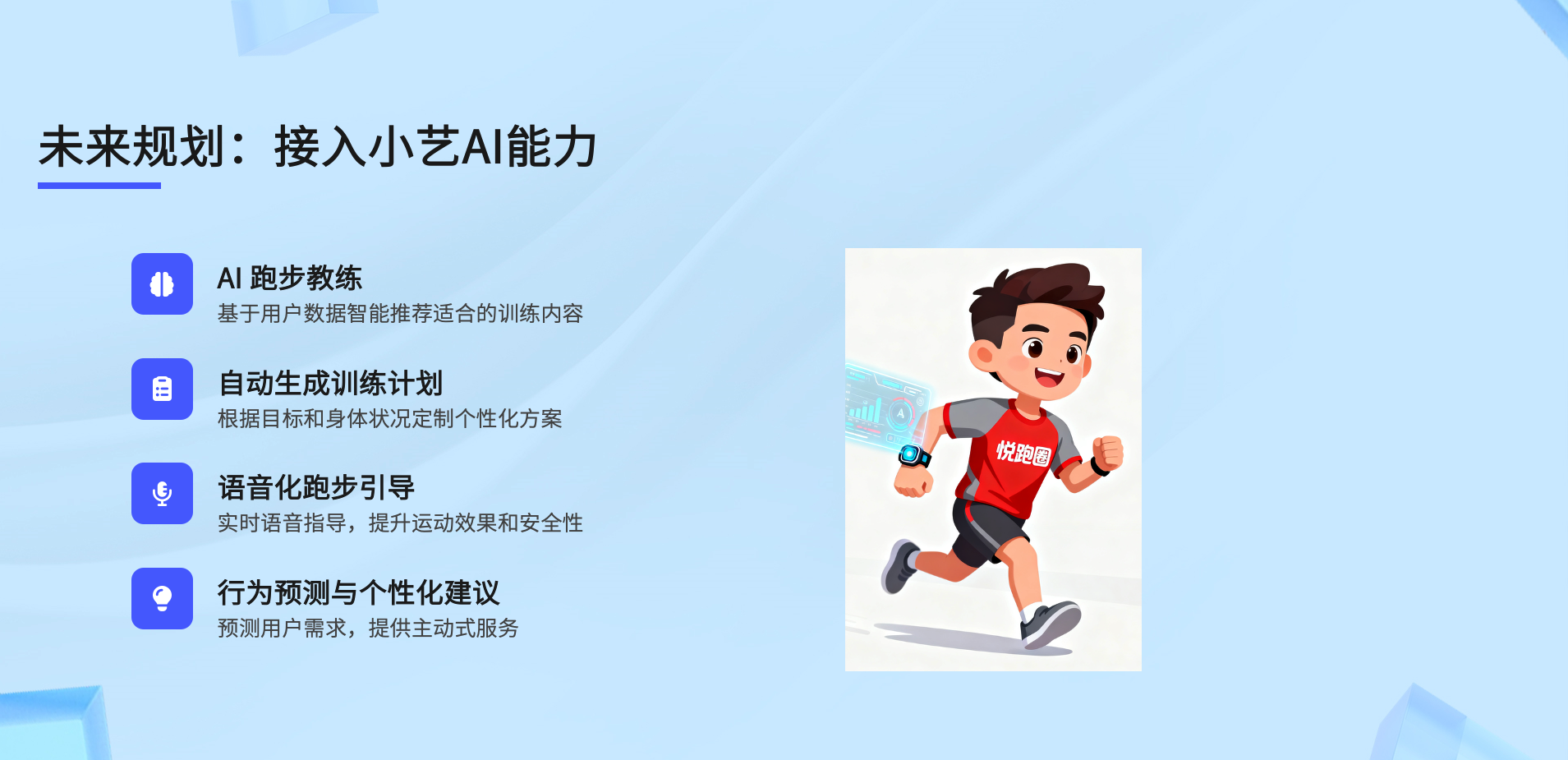 - AI跑步教练:基于用户数据智能推荐训练内容,自动生成符合用户目标与身体状况的个性化训练计划;